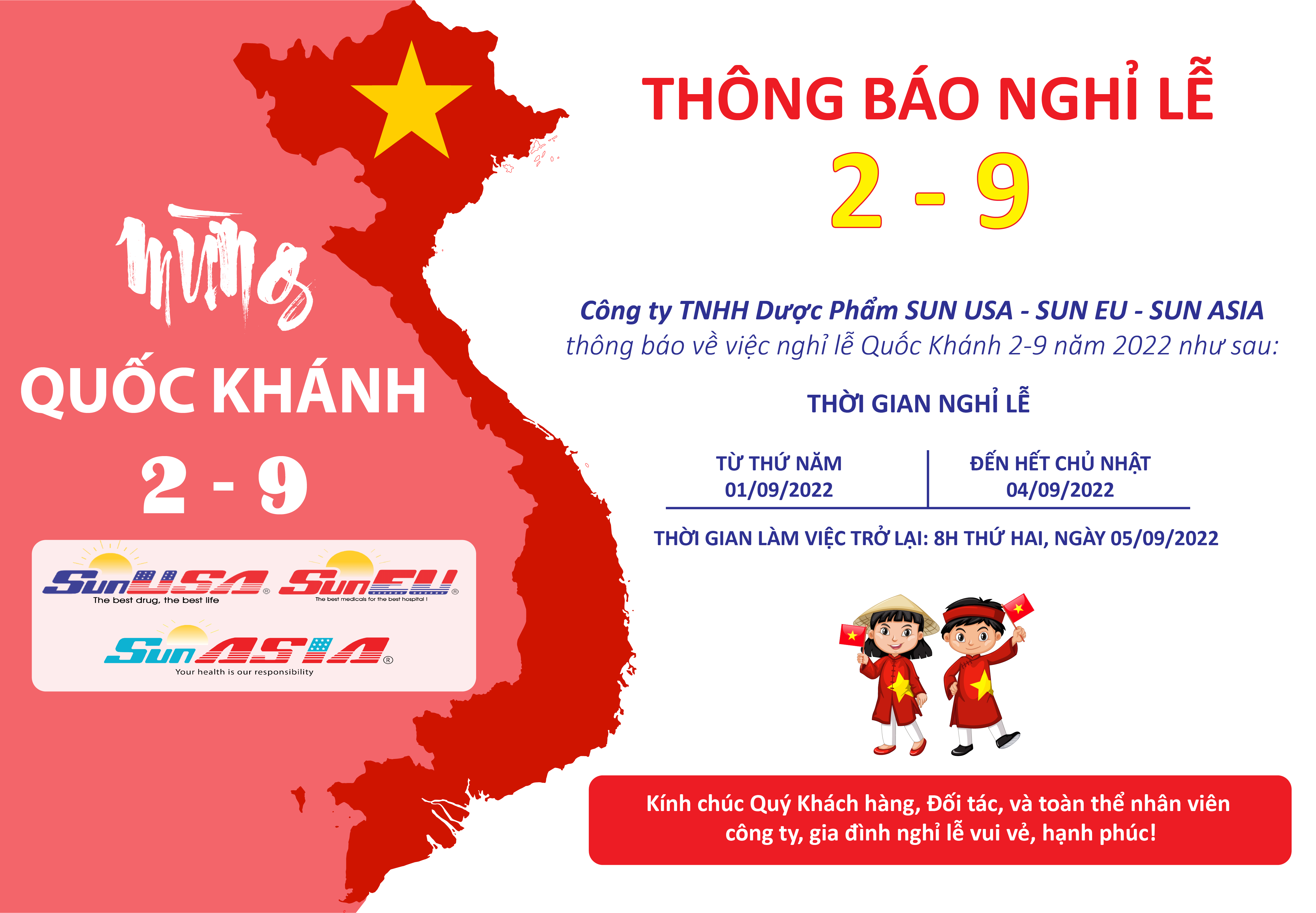 Công ty TNHH Dược Phẩm SUN USA-SUN EU -SUN ASIA thông báo về việc nghỉ Lễ Quốc Khánh 2-9 như sau: