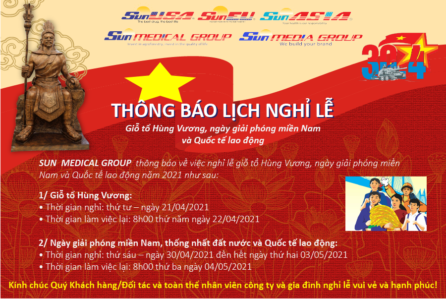 Công ty SUN Medical Group thông báo, lịch nghỉ lễ Giỗ tổ Hùng Vương, ngày giải phóng miền Nam và Quốc tế lao động)