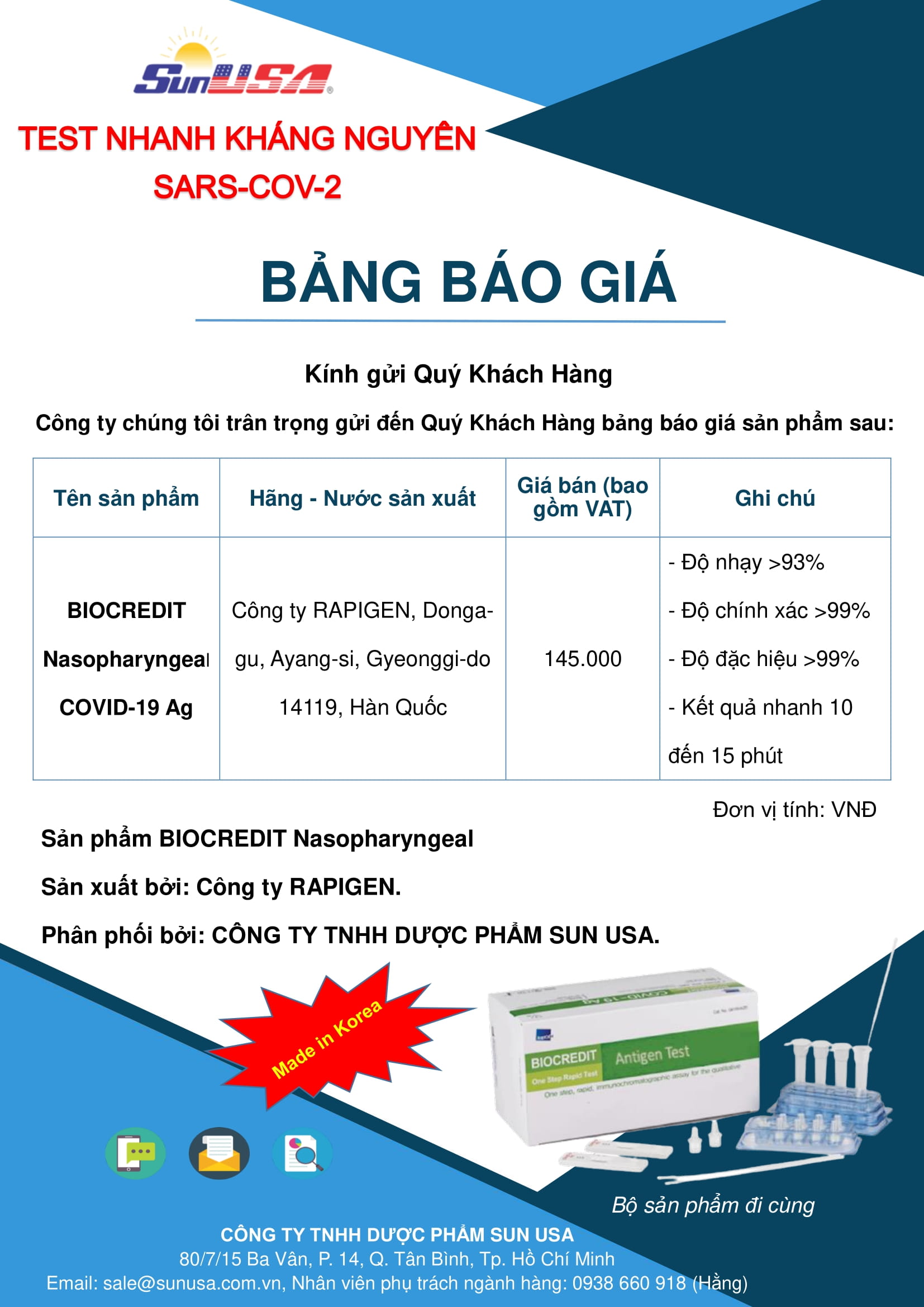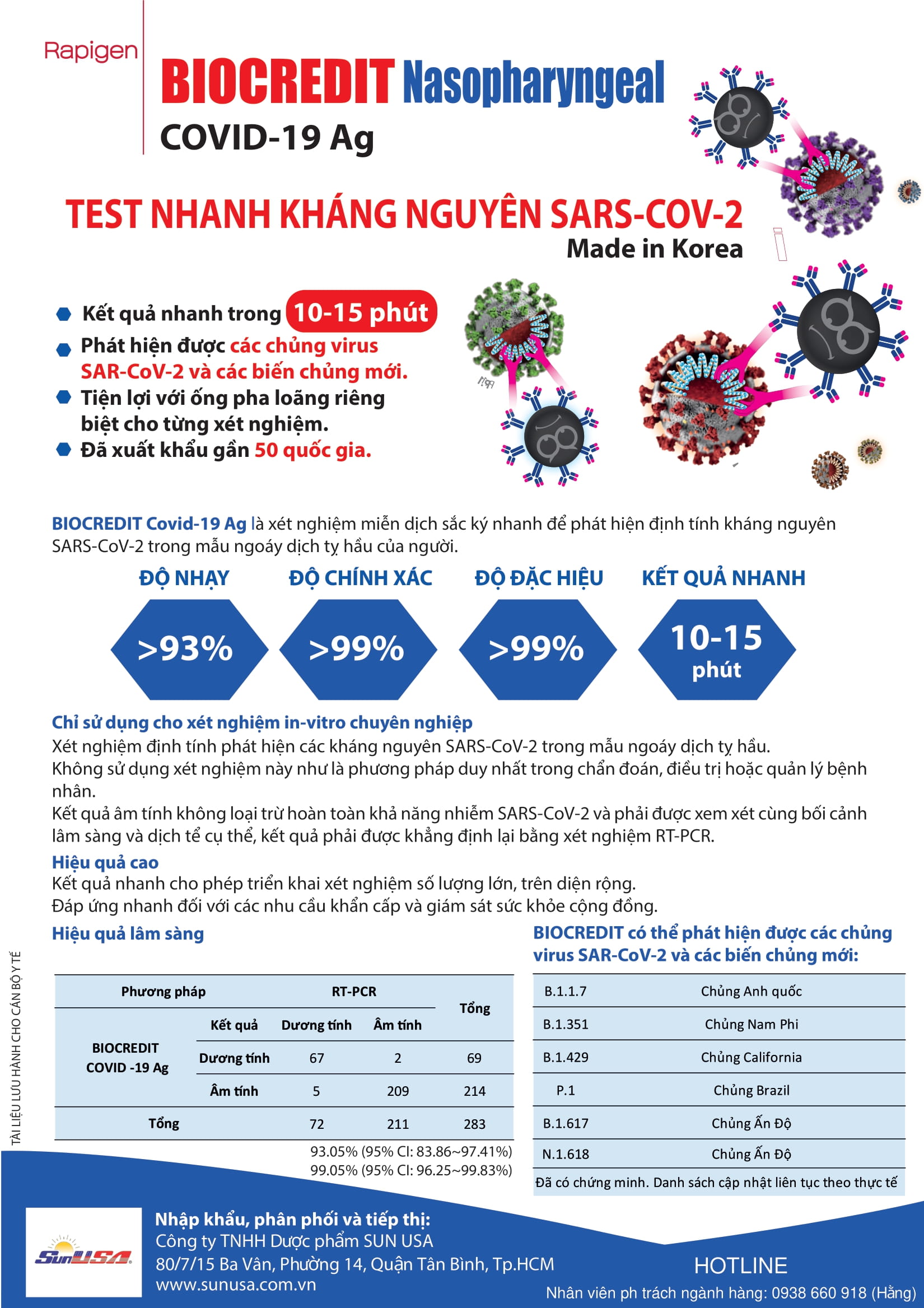 BIOCREDIT Nasopharyngeal Covid-19 Ag là xét nghiệm miễn dịch sắc ký nhanh để phát hiện định tính kháng nguyên SARS-CoV-2 trong mẫu ngoáy dịch tỵ hầu của người. Kết quả nhanh trong 10-15 phút, phát hiện được các chủng virus, SAR-CoV-2 và các biến chủng mới, tiện lợi với ống pha loãng riêng biệt cho từng xét nghiệm, đã xuất khẩu gần 50 quốc gia.