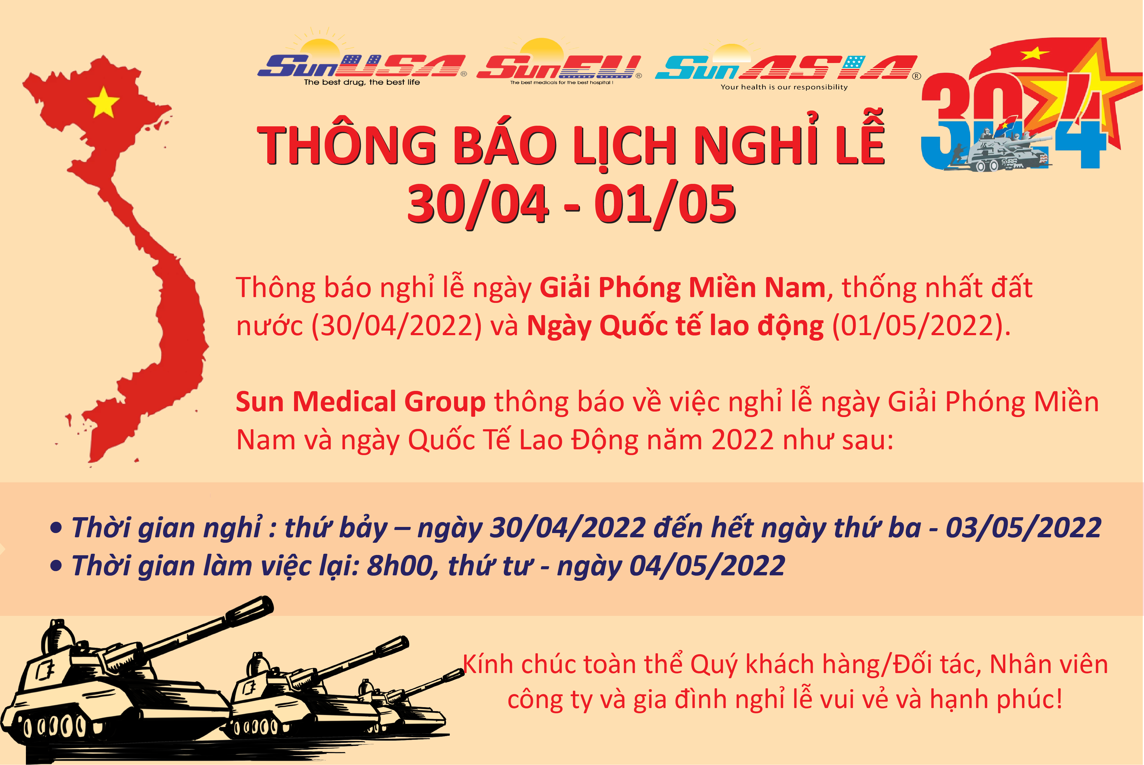 Công ty TNHH Dược Phẩm SUN USA-SUN EU -SUN ASIA thông báo về việc nghỉ Lễ Giải phóng Miền Nam và Quốc tế Lao động như sau:
