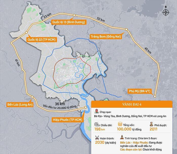 Còn vành đai 4 dài khoảng 198 km, khởi đầu tại nút giao đường cao tốc Biên Hòa - Vũng Tàu, khu vực Phú Mỹ và điểm cuối nối với trục Bắc - Nam tại khu vực cảng Hiệp Phước, TP HCM. Đoạn qua TP HCM khoảng 48,3 km, riêng đoạn qua địa bàn Củ Chi dài khoảng 16,75 km.