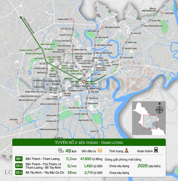 Về hạ tầng đường sắt, tuyến metro số 2 Bến Thành - Tham Lương dài 48 km, ở giai đoạn 3 dài 28 km sẽ nối tuyến từ Bến xe An Sương đến quận 12, Hóc Môn, Củ Chi.